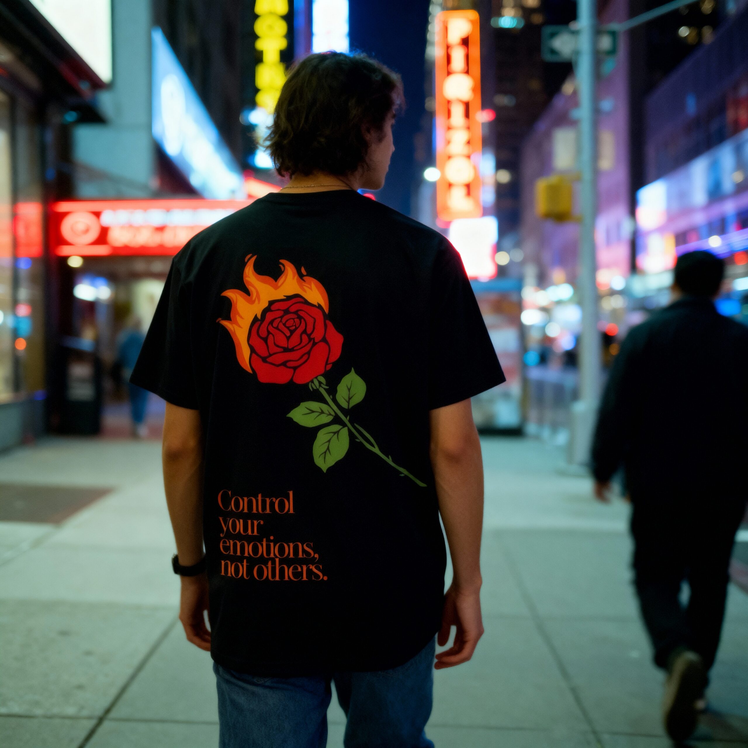 Design: Hořící růže jako symbol vášně a síly, doplněná citátem: